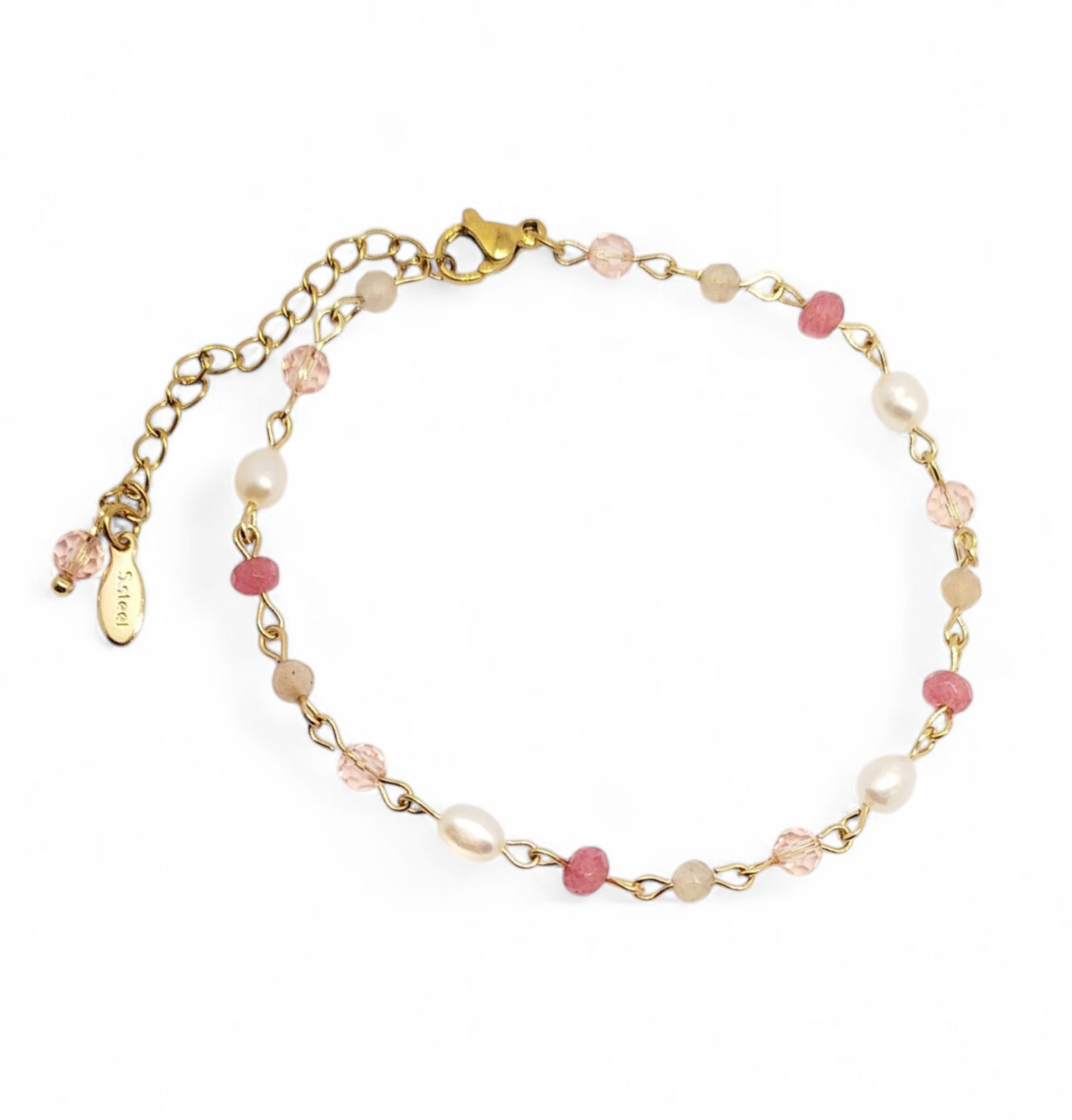 Smukt armbånd med ferskvandsperler, sunstones og jadesten. 304 rustfrit stål forgyldt med 18 karat guld.