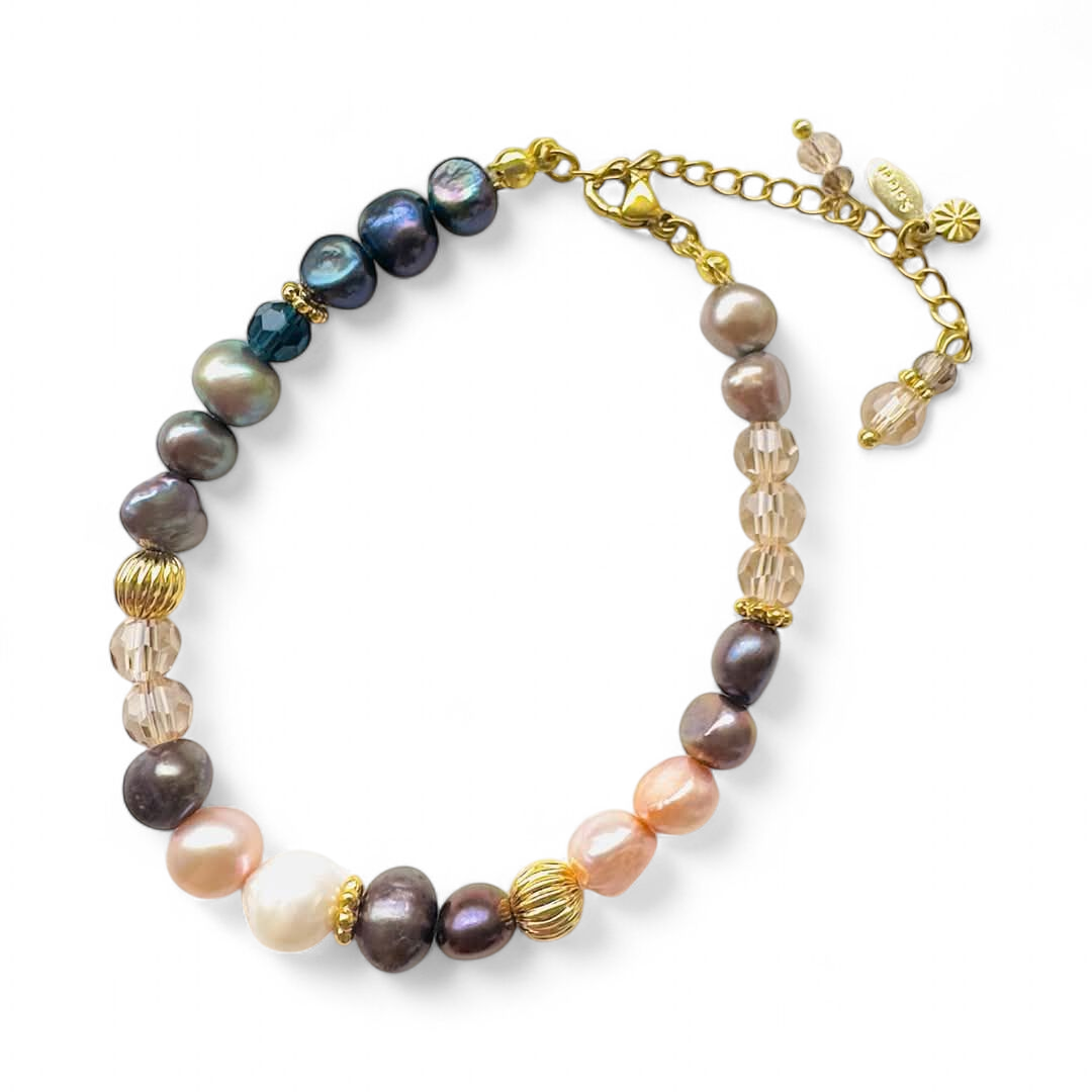 Smuk armbånd med mørke og lyse ferskvandsperler. Lavet på stål forgyldt med 18 karat guld. Vandfast.